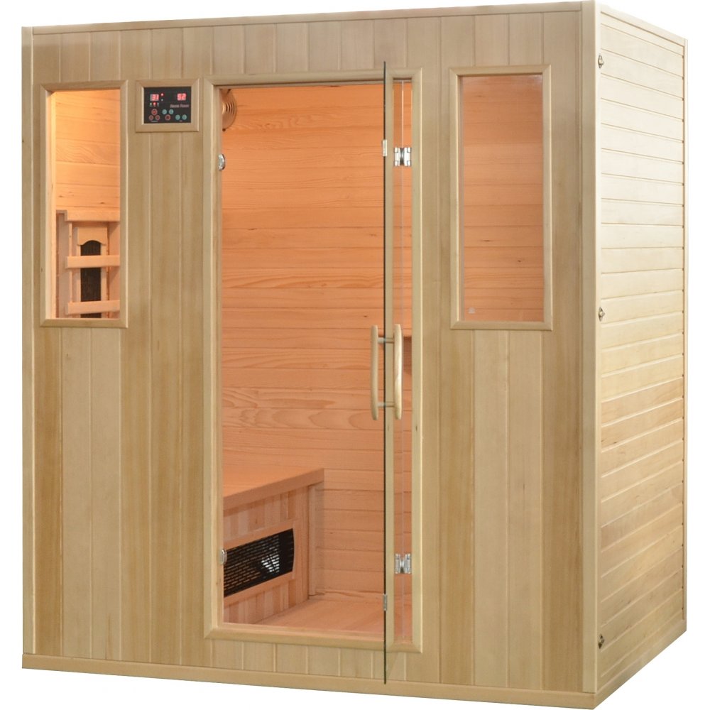 Moderne badstue for 4 personer. Badstuepakken leveres komplett med 8 keramiske varmepaneler, kontrollenhet og ozongenerator. Ozongeneratoren renser luften og bekjemper dårlig lukt ved å bekjempe bakterier og mugg. Kontrollenheten har FM-radio og CD-spiller, samt temperatur- og tidsjusteringer. De doble kontrollpanelene lar deg styre badstuen både fra innsiden og utsiden