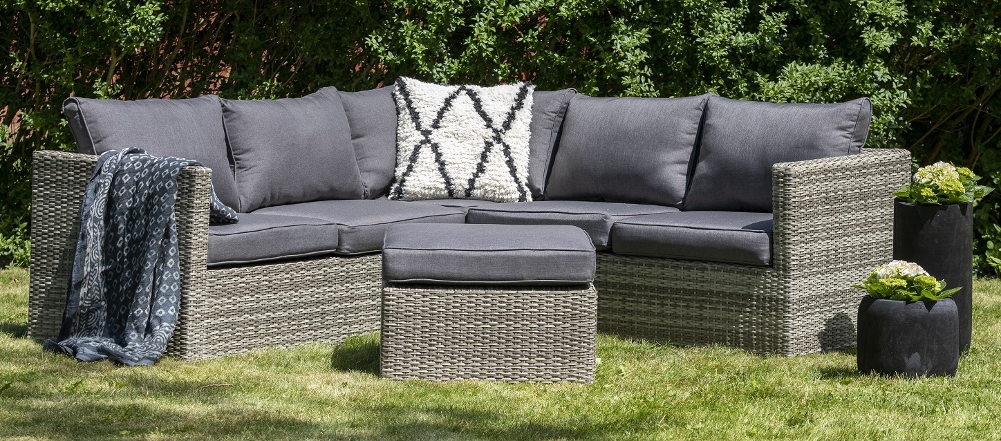 Ingelstorp hjørnesofa i grå kunstrotting med matchende fotskammel. Lysegrå puter med god komfort. Kombiner gjerne med ett av våre utebord.