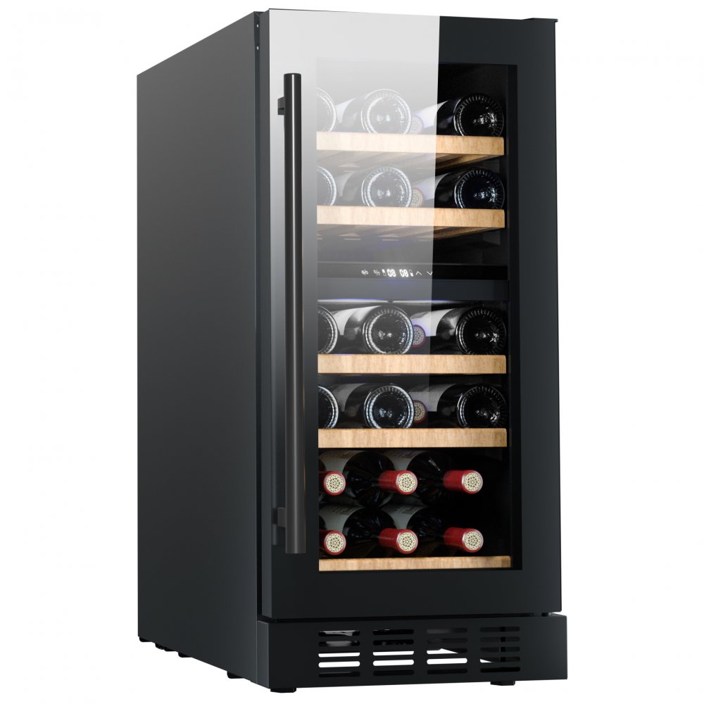 Dette innebygde vinkjøleren har plass til 26 flasker og er et utmerket valg for de som ønsker å oppbevare vin under optimale forhold. Kjøleskapet har et stilig svart design med en sikkerhetsglassdør, en slitesterk PVC-ramme og fem trehyller. Med en justerbar temperatur mellom 5 og 18 °C kan du enkelt tilpasse lagringen for ulike typer vin - fra friske hvitviner til fyldige rødviner.