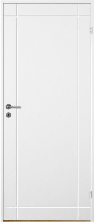 Hvitmalt kompakt innerdør med sporfrest dekor.