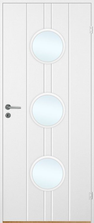 Hvitmalt kompakt innerdør med sporfrest dekor og glassrute for mye lysgjennomgang.