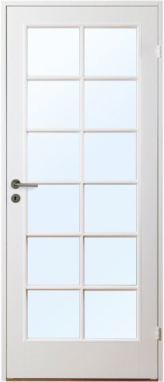 Hvitmalt kompakt innerdør i klassisk speilinndeling for stor lysgjennomstrømming.