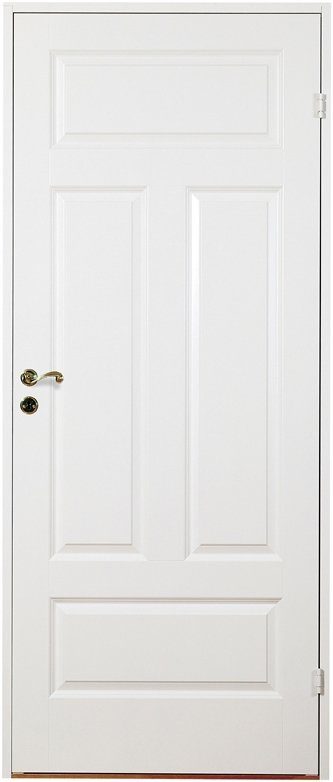 Hvitmalt dør med dekorplate i klassiske speil-inndeling. Serien Farö er støpte dører - Støpt overflate med klassisk utseende.