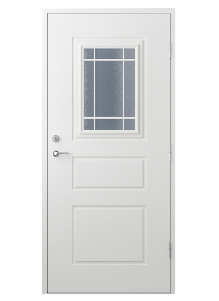 Inngangsdør Sofia-design er inspirert av dørdesign fra århundreskiftet som ble produsert med ideen om å dekorere bygninger. Derfor er denne vakre døren ikke bare en solid dør designet for vårt svenske klima, men også en fryd for øyet. Med sitt store vindu slipper døren rikelig med lys inn og gir hallen et hyggelig miljø. De dekorative listene festes og blir prikken over i-en sammen med det fine glasset.
