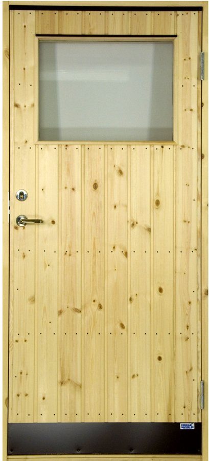 Boddør med glass (inkludert karm og låsekasse) Fra Furuhälls Snickeri , beregnet for lagring/lokale som ikke oppvarmes til mer enn +10 °C. Ved høyere temperaturer kan dørens utseende påvirkes.
