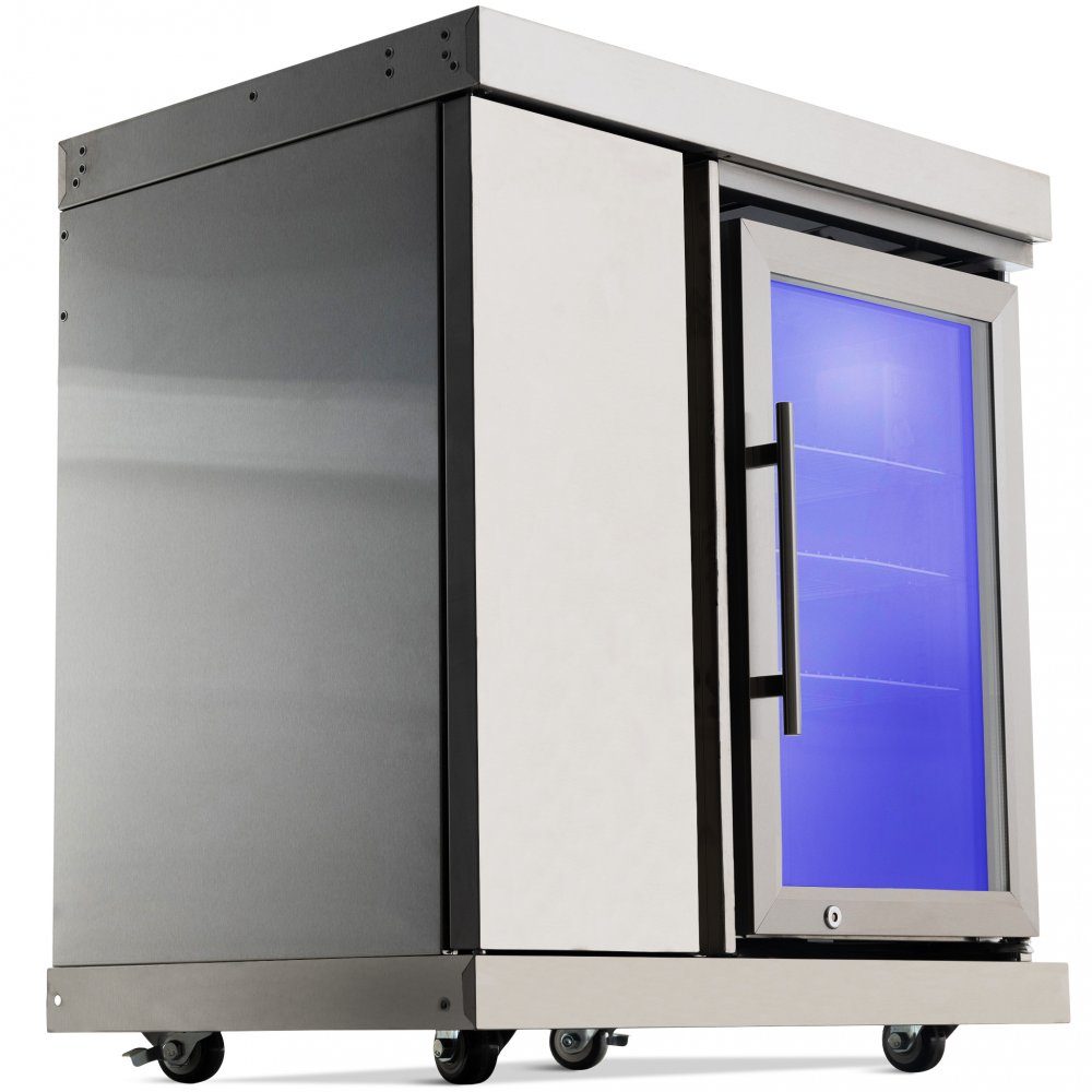 Dette kjøleskapet for utendørs gassgriller er laget utelukkende av rustfritt stål. Alle sidevegger, dører, skap (innvendig/utvendig) er laget av rustfritt stål. Et typisk kjøleskap for innendørs bruk har kun en front i rustfritt stål. Denne utendørsmodellen er laget av rustfritt stål rundt alle sider, samt innsiden av sideskapet.