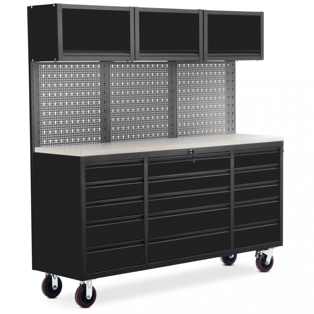 Disse garasjemøblene er utstyrt med hjul og håndtak for enkel flytting dit du trenger dem. To av hjulene er låsbare for å gi stabilitet under arbeid. Med totalt 15 skuffer og tre overskap er det god plass til verktøy, små deler og større utstyr.