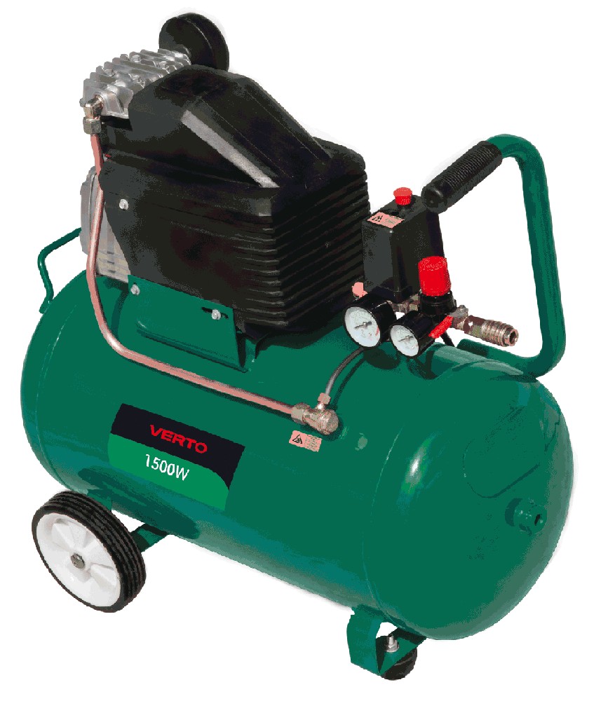 50 l kompressor, oljesmurt med 1500 W effekt, liten for enkel oppbevaring. Bra som kompletterende utstyr i verksted eller garasje. Verktøyet drives med nettspinning 230 V ~ 50 Hz og med kapasitet på 50 L. Den kan brukes til å forsyne oljepistoler, fylle på dekk og andre små oppgaver.