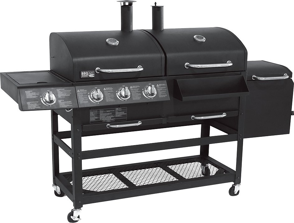 En stor grill for mestere som ønsker mye plass og kontroll på grillen sin. Du kan bruke gass, kull og røykflis med denne allsidige grillen. Gassgrillen, kullgrillen og røykboksen har hver porselenstøpte støpejernsgitter som er holdbare og enkle å rengjøre. Røykboksen har en dør på siden hvor du kan fylle på flis/kull under tilberedningen.
