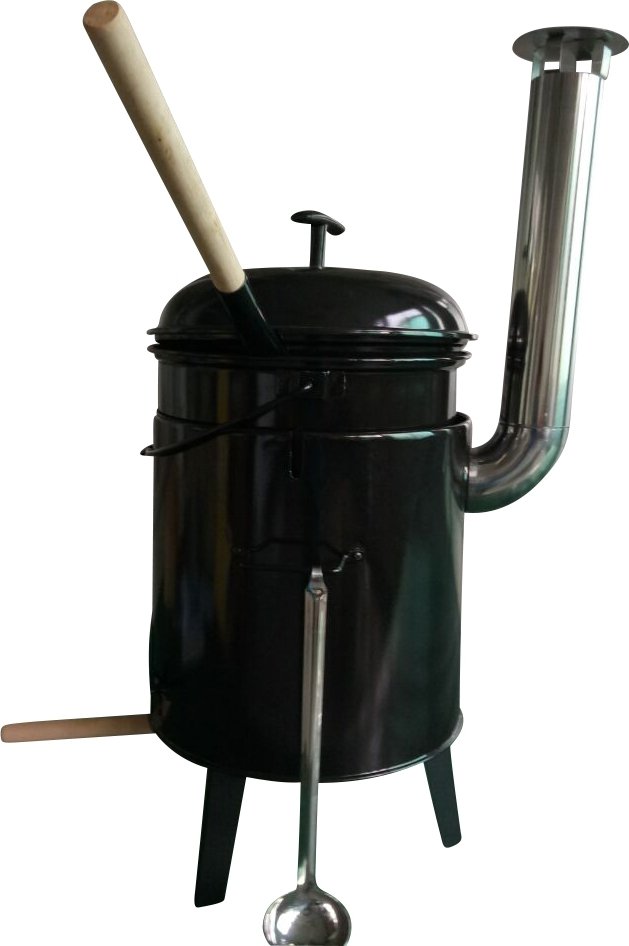 Grytegrill for utendørsbruk med håndtak og skorstein av rustfritt stål.