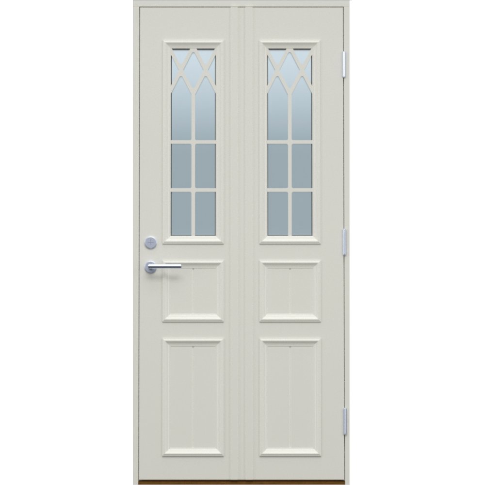 En klassisk ytterdør som passer perfekt for en større døråpning hvis man ikke ønsker å bruke dobbel dør. Den ser ut som en dobbel ytterdør, noe som er nødvendig i en større døråpning.