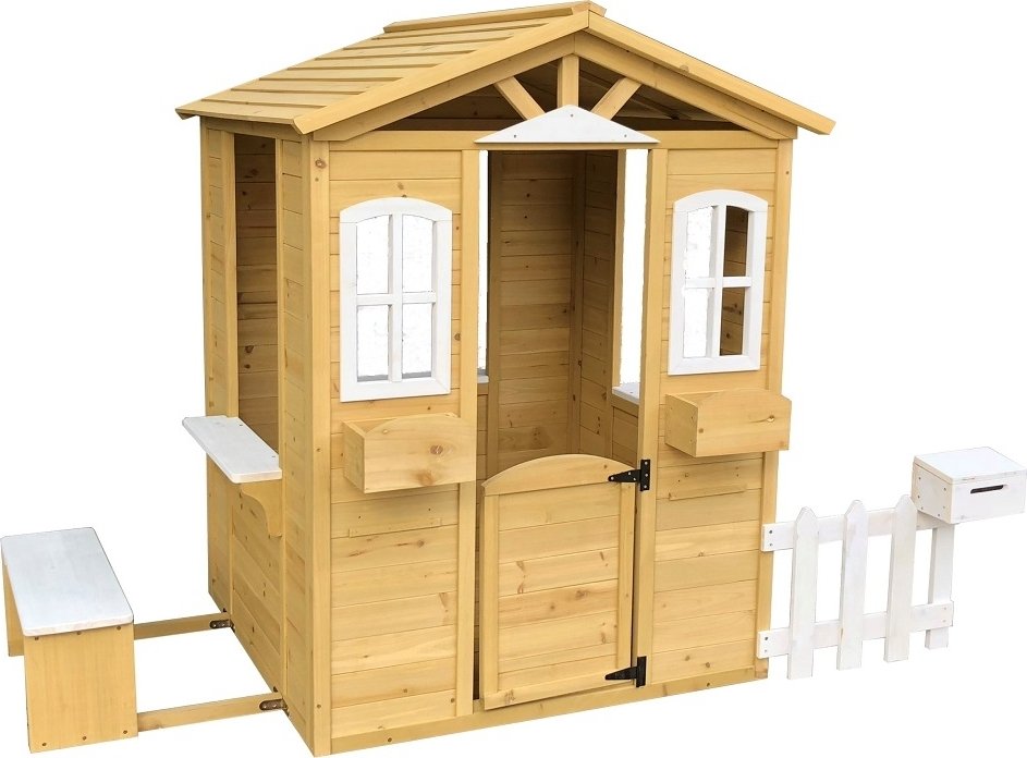 Ferdigmalt flott lekehus i lyse farger og med svingdør.