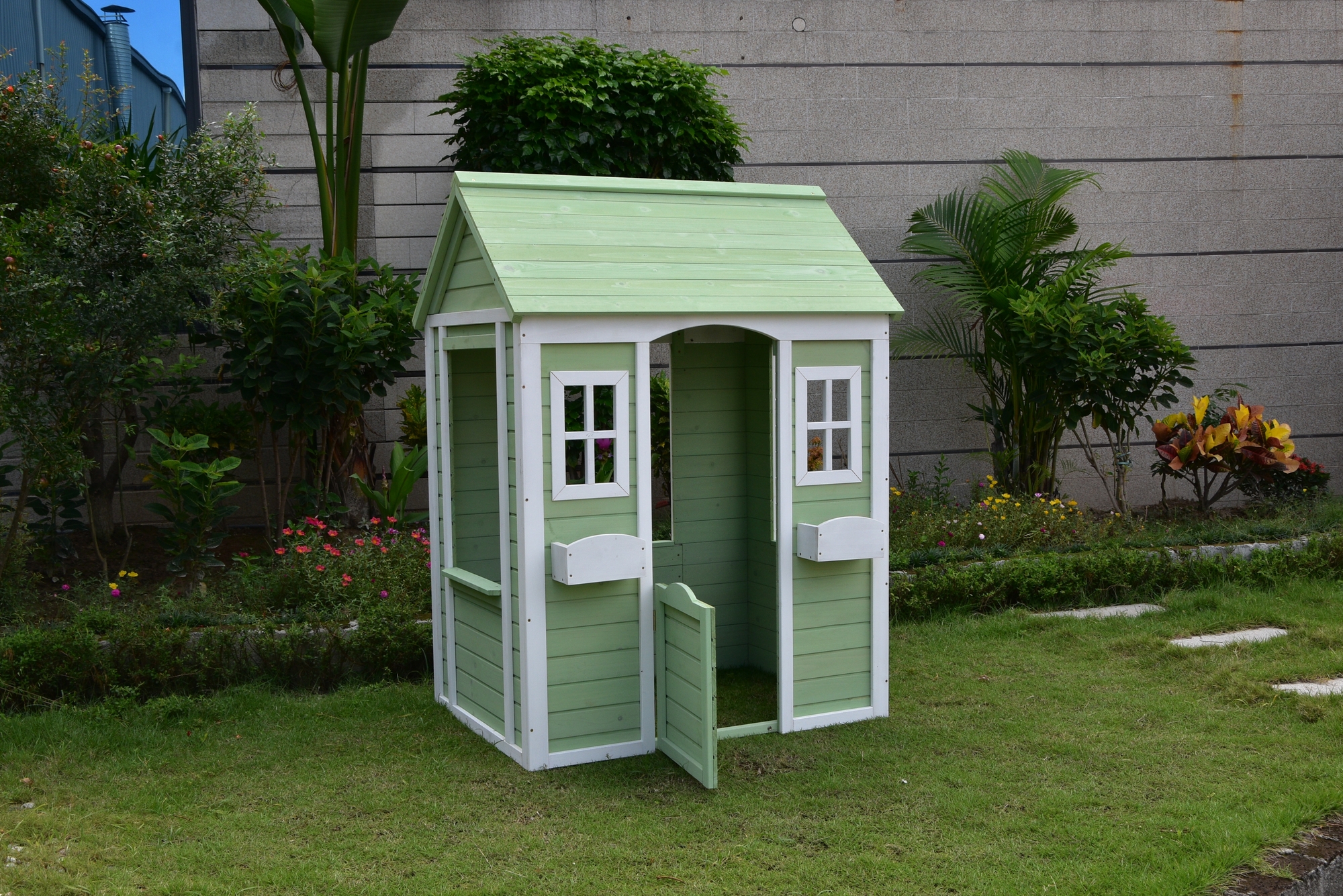 Dette lekehuset i et lekent grønt og hvitt design er et perfekt sted for barn å trene fantasien og leke. Med sitt koselige interiør er den ideell for både innendørs og utendørs lek. Laget av slitesterkt tre, tilbyr lekehuset langvarig bruk og passer perfekt i hagen.