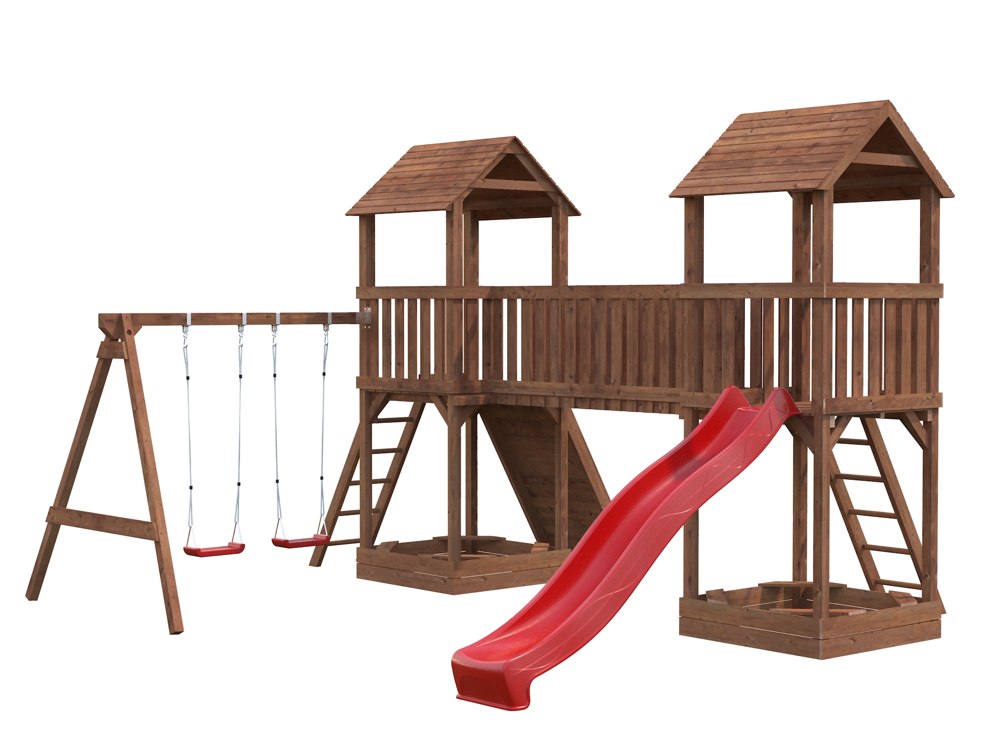 Et stort og høykvalitativt lekestativ i tre, perfekt for bakgården. Lekestativ består av to klartetårn med en gangbro mellom bjelke for husker. Stativet har en brun trykkbehandling og er FSC-sertifisert. Det er plass til å feste en sklie ved et av tårnene. Sklie er ikke inkludert.
