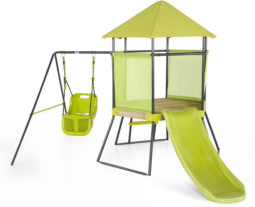 Dette vakre lekestativet i grønt beskytter mot solen på solfylte dager samtidig som barna får mulighet til å utvikle seg fysisk med lek og støy.