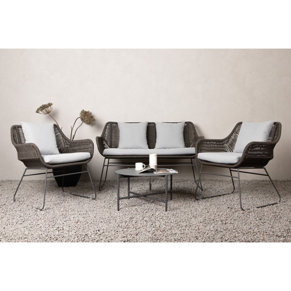 Stilig og gjennomtenkt møbelgruppe som kombinerer komfort og eleganse for uterommet ditt. Designet med fokus på både funksjon og estetikk, perfekt for de som ønsker å skape et innbydende uterom. Gruppen består av en romslig toseters sofa, to komfortable lenestoler og et praktisk bord, en komplett løsning for både avslapning og sosiale stunder. For ekstra komfort er sju myke puter inkludert, noe som gjør det enkelt å sitte ned og nyte den over lengre tid. Den tidløse kombinasjonen av brun ramme og grå puter gir et harmonisk og moderne uttrykk som passer inn i de fleste utemiljøer. Enten du plasserer gruppen på terrassen, uteplassen eller i hagen, vil den være et naturlig blikkfang. Med sitt gjennomtenkte design skaper den en varm og innbydende atmosfære, perfekt for alt fra stille stunder til hyggelige sammenkomster.
