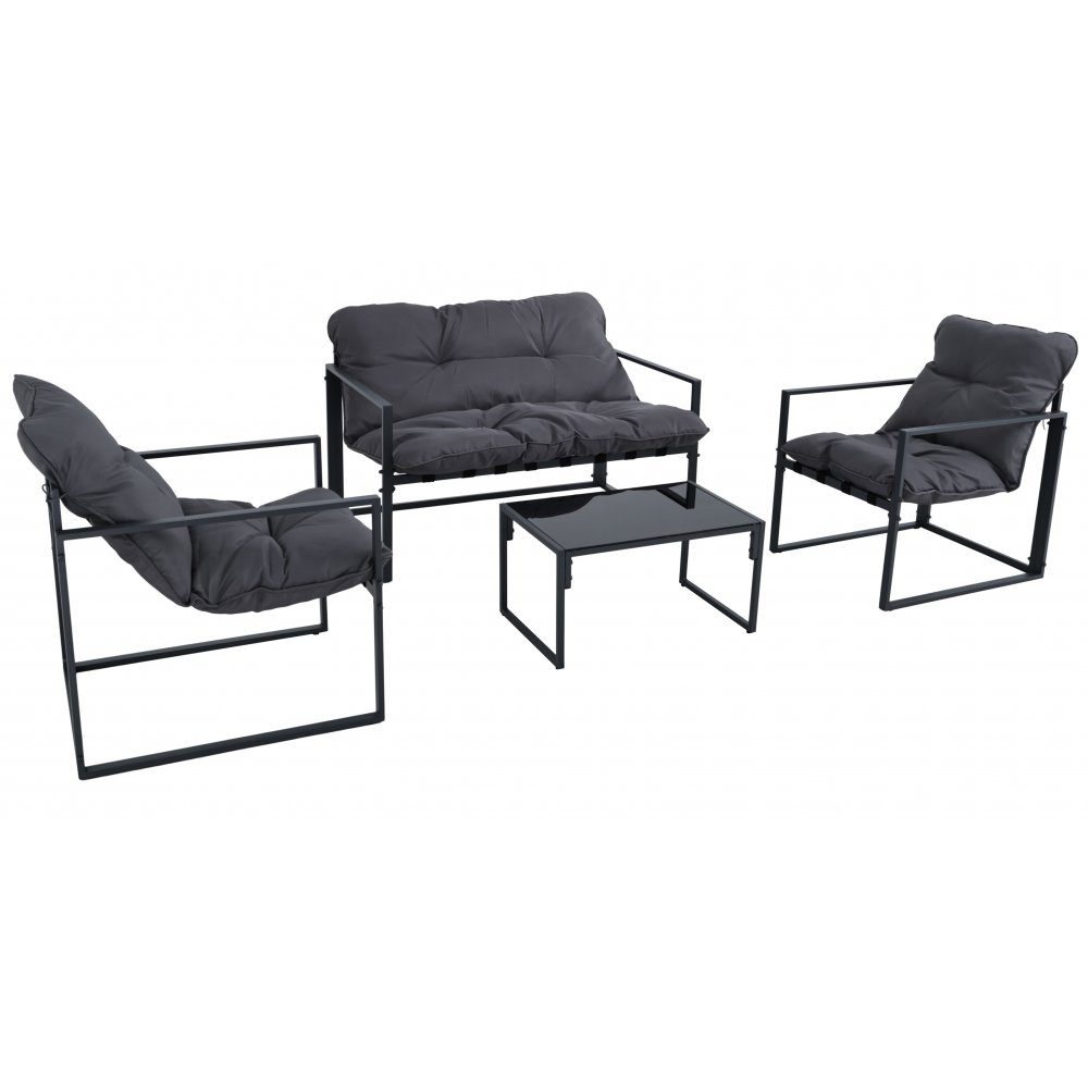 Loungegruppe med fokus på både komfort og estetikk. Denne gruppen inkluderer en sofa, to lenestoler og et stilig salongbord med herdet svart glass. De myke, mørkegrå putene som følger med både sofa og lenestoler bidrar til en komfortabel sitteopplevelse som er perfekt for alle utendørs anledninger.