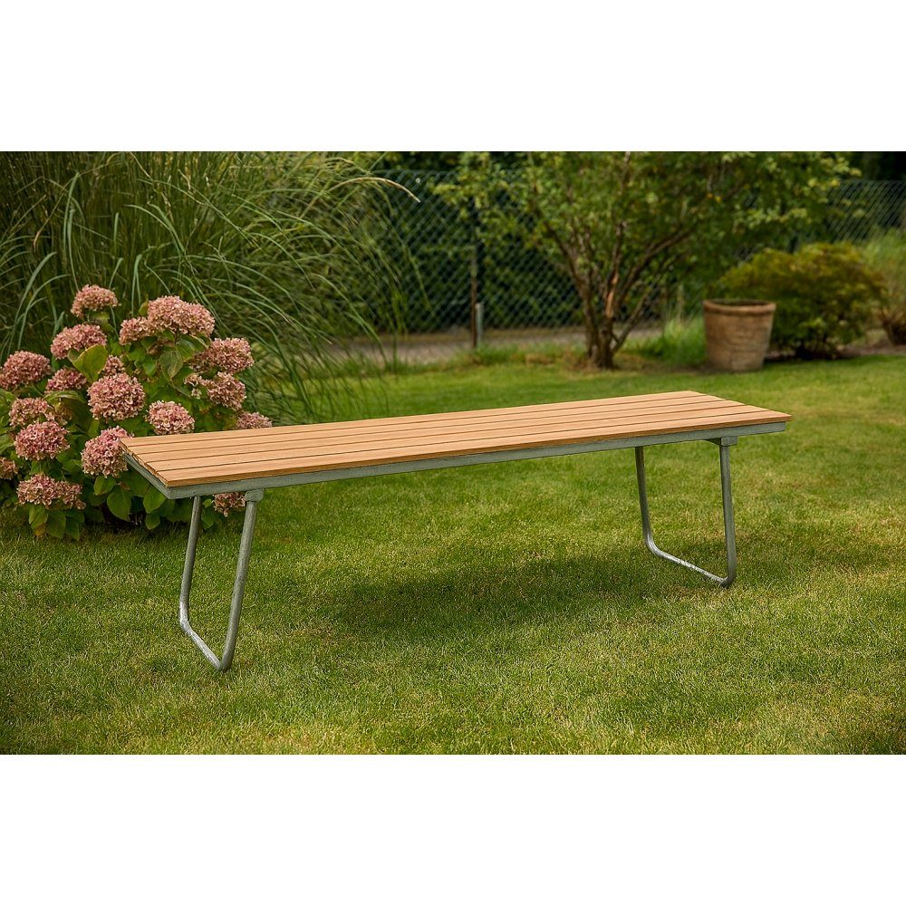 En stilig hagebenk med galvanisert stålramme og teaksete. Denne benken er enkel å plassere og passer perfekt mot husets solfylte vegg ved kaffeservering. Designet er tidløst med tradisjonell design og bruksområdet er bredt. Møbler sammen med et lavere bord eller kabal mot en vegg - du bestemmer.