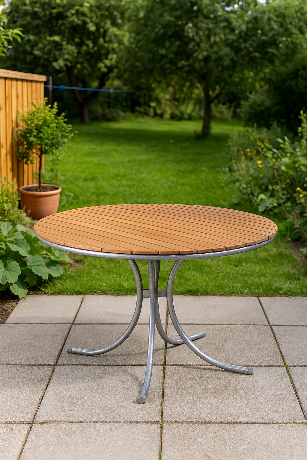 Utegruppen består av et rundt spisebord Ø110 cm med 4 tilhørende stoler.
