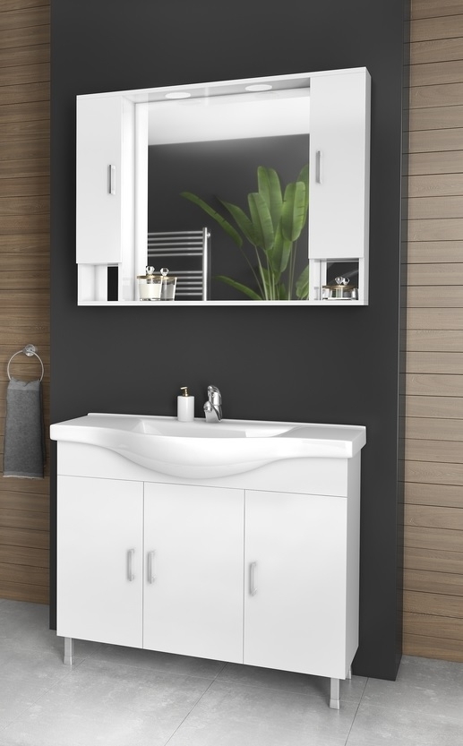 Alba Møbelpakke fra Nordamist med et hvitt Gulvstående servantskap, servant av porselen og et speilskap.