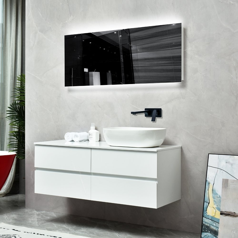 Moderne servantskap med speil. Det stilrene og den lyse fargen gir et moderne og minimalistisk inntrykk som minner om våre stolte skandinaviske design. Vasken er en avrundet skål som gir et mykt og innbydende preg. Servantskapet har et enkelt og praktisk design. Skuffene er veldig romslige og lett tilgjengelige for oppbevaring, sammenlignet med et tradisjonelt skapdesign. Matchende speil inkludert.