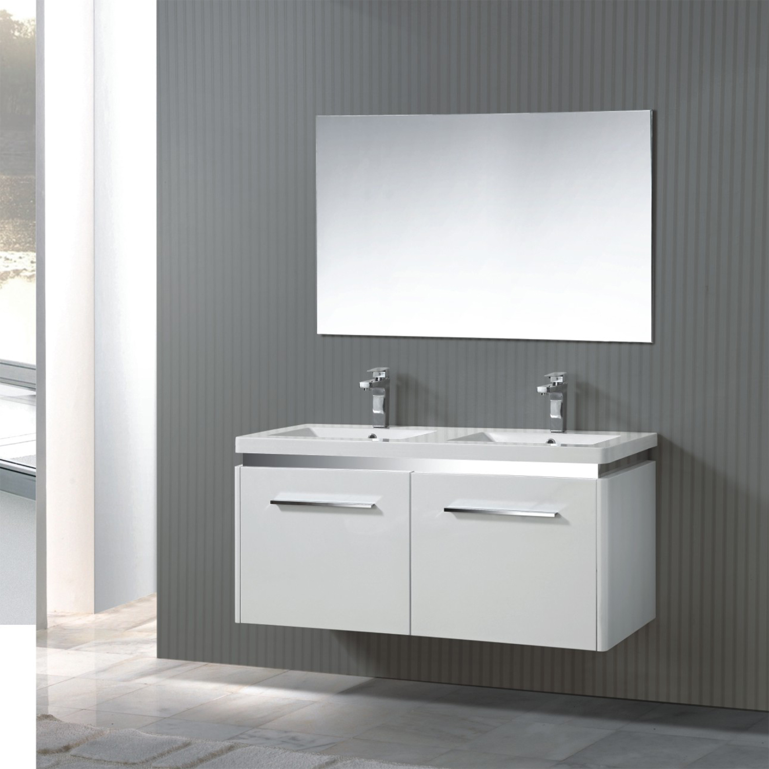 Dobbelt servantskap med speil. Det stilrene og den lyse fargen gir et moderne og minimalistisk inntrykk som minner om våre stolte skandinaviske design. Skapet er väggmonterat og har dubbelvask for to personer. Matchende speil inkludert.