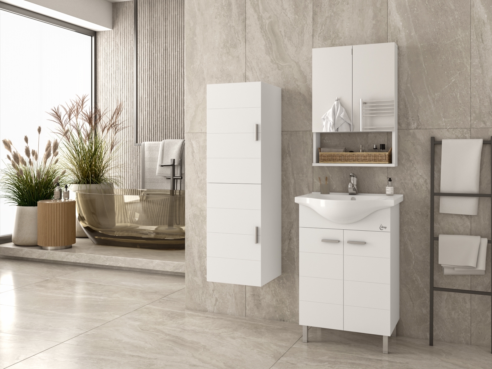 Capri Møbelpakke fra Nordamist med et hvitt Gulvstående servantskap, servant av porselen og et speil.