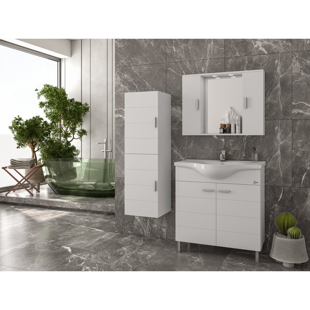 Capri Møbelpakke fra Nordamist med et hvitt Gulvstående servantskap, servant av porselen og et Speilskap.