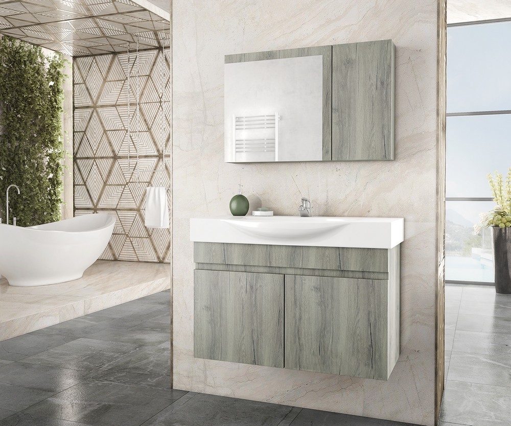 Møbelpakke fra Nordamist med brunt veggmontert servantskap og integret servant og speilskap.