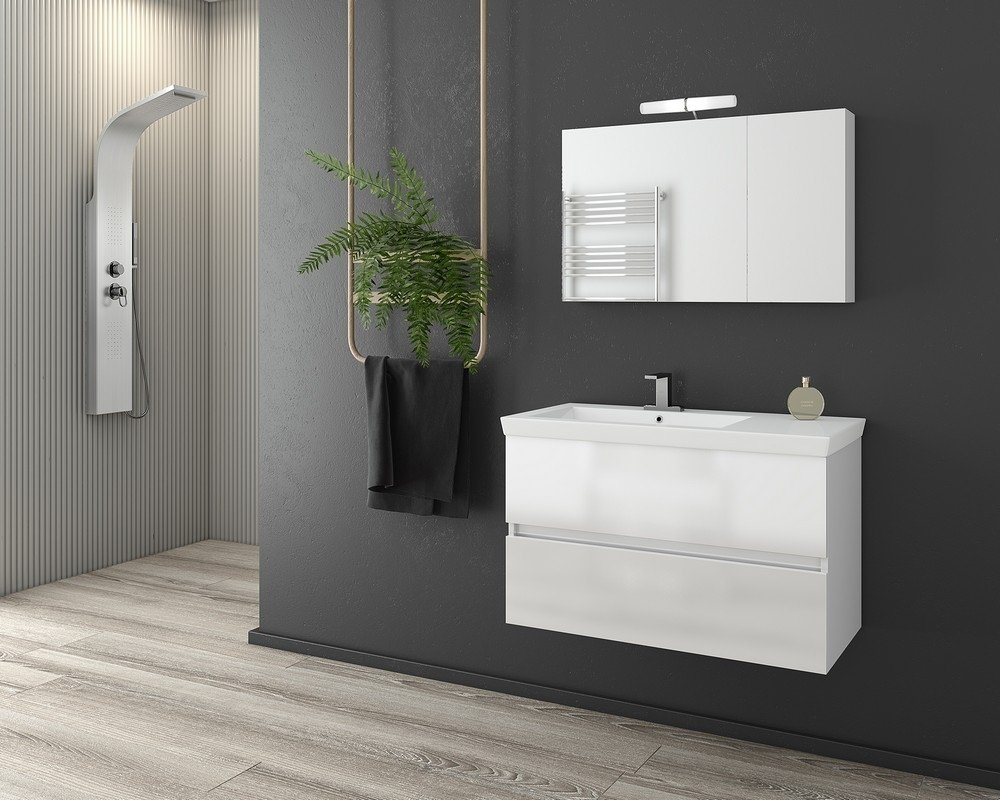 Luxus Møbelpakke fra Nordamist med et veggmontert servantskap i Treimitasjon, porselensplate & integrert servant i porselen, Speilskap og belysningspakke fysi.