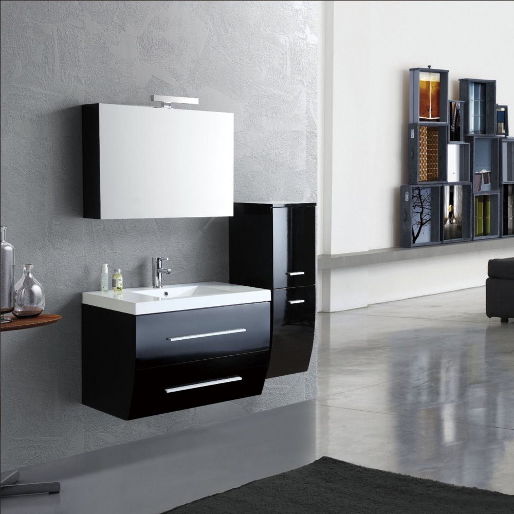 Europeiske baderomsmøbler med et blank svart design. Hvit keramikkvask er inkludert. Designet på skapene er stilrent, minimalistisk og passer perfekt til skandinavisk design. Servantskapet har et enkelt og praktisk design. Skuffene er svært romslige og lett å komme til for oppbevaring sammenlignet med et tradisjonelt skapdesign.