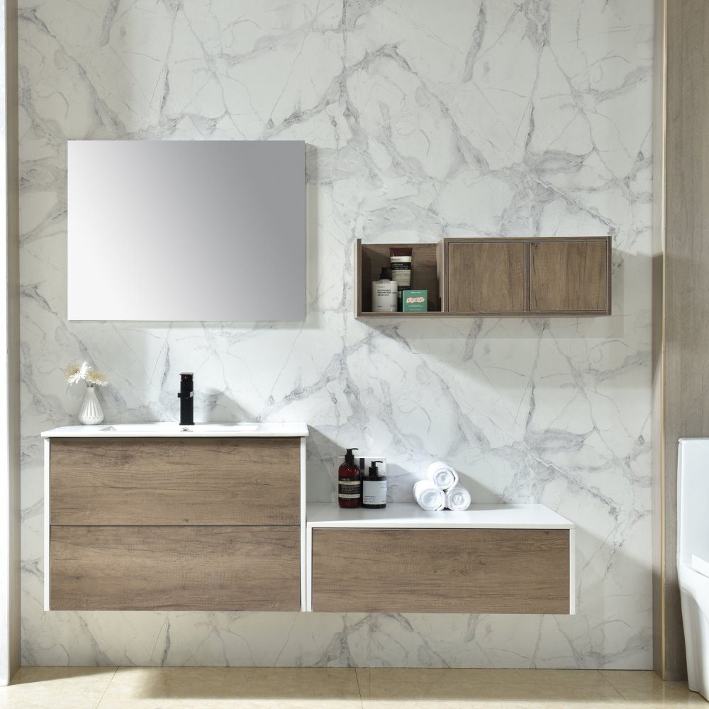 Europeiske baderomsmøbler med lyst tredesign. Hvit keramikkvask er inkludert. Designet på skapene er stilrent, minimalistisk og passer perfekt til skandinavisk design. Servantskapet har et enkelt og praktisk design. Skuffene er svært romslige og lett å komme til for oppbevaring sammenlignet med et tradisjonelt skapdesign.