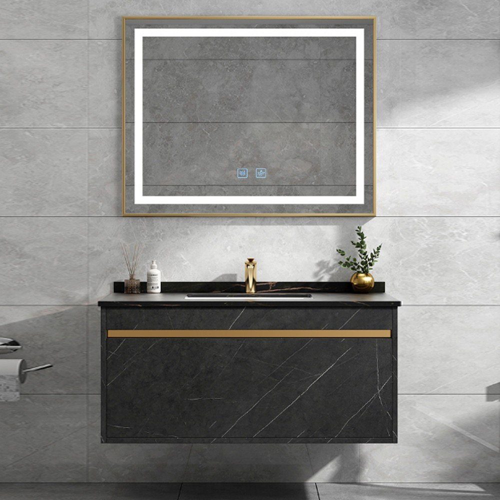 Europeiske baderomsmøbler med svart design. Keramikkvask er inkludert. Designet på skapene er stilrent, minimalistisk og passer perfekt til skandinavisk design. Skapet har gullkant ved håndtaket og som ramme rundt speilet. Speilet motvirker dugg og er utstyrt med LED-lys.