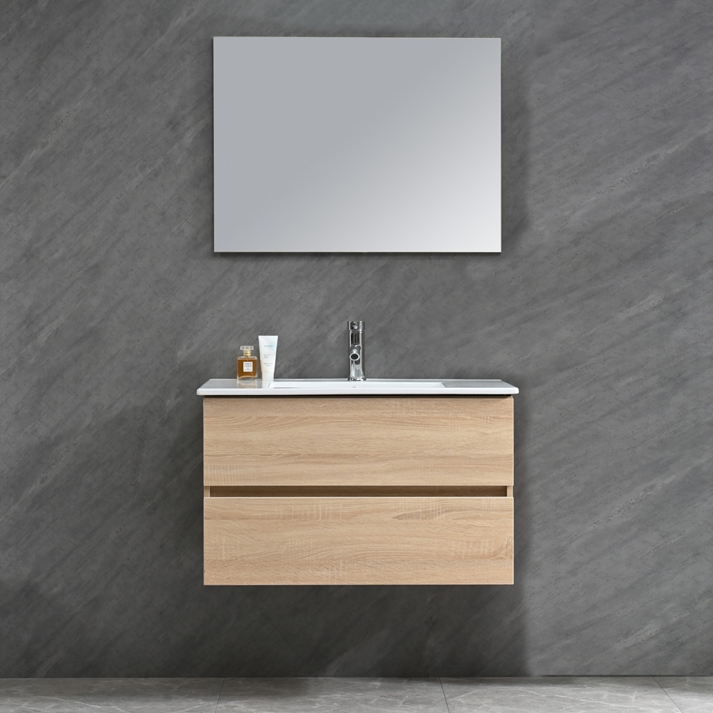 Europeiske baderomsmøbler med tredesign. Hvit keramikkvask er inkludert. Designet på skapene er stilrent, minimalistisk og passer perfekt til skandinavisk design. Servantskapet har et enkelt og praktisk design. Skuffene er svært romslige og lett å komme til for oppbevaring sammenlignet med et tradisjonelt skapdesign.