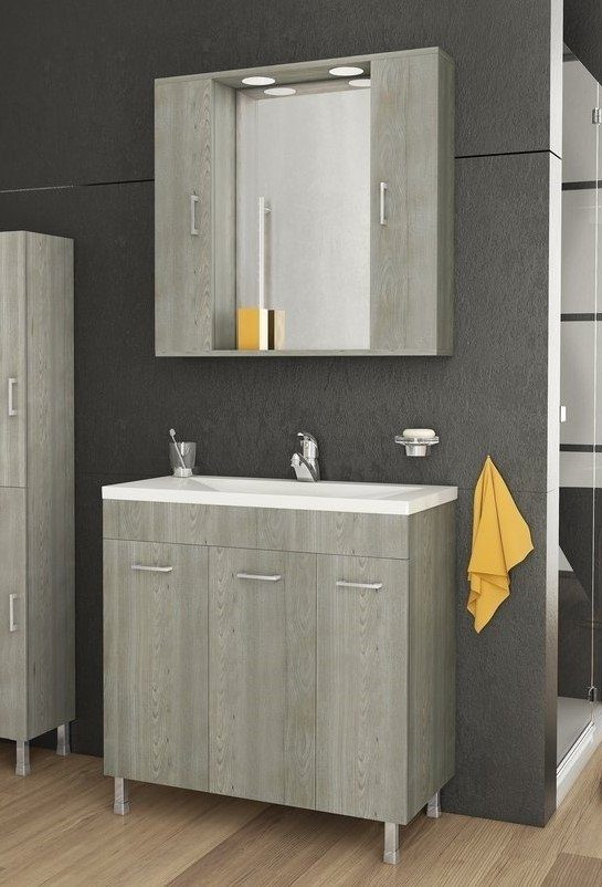 Militos Møbelpakke fra Nordamist med et gulvstående servantskap i brun eikefinish, porselensplate & integrert servant i porselen og et speilskap.