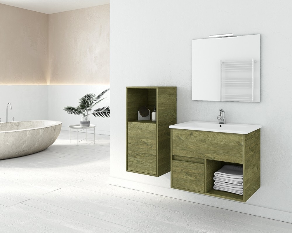 Sorrento møbelpakke fra Nordamist med et naturfarget veggmontert servantskap i tre, sideskap, porselensplate og integrert porselenservant, veggspeilenhet og belysningspakken Celia.