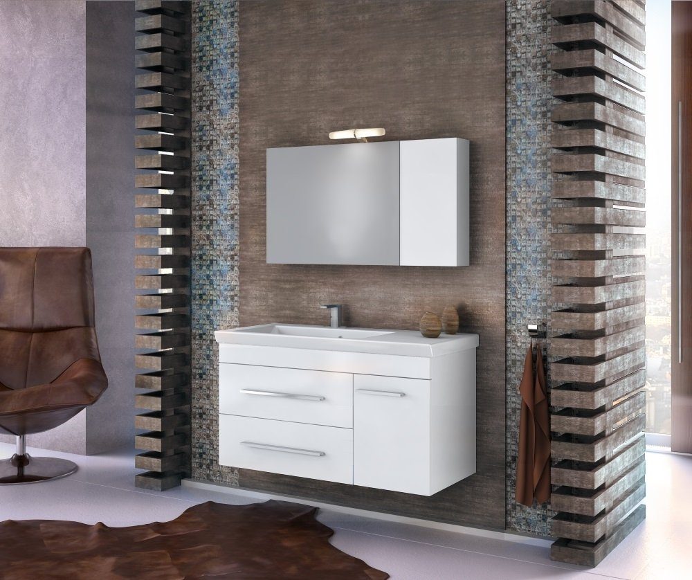 Status møbelpakke fra Nordamist med en eggmontert servantskap i hvitt, porselensplate og integrert servant av porselen, speilskap og Fysi belysningssett.