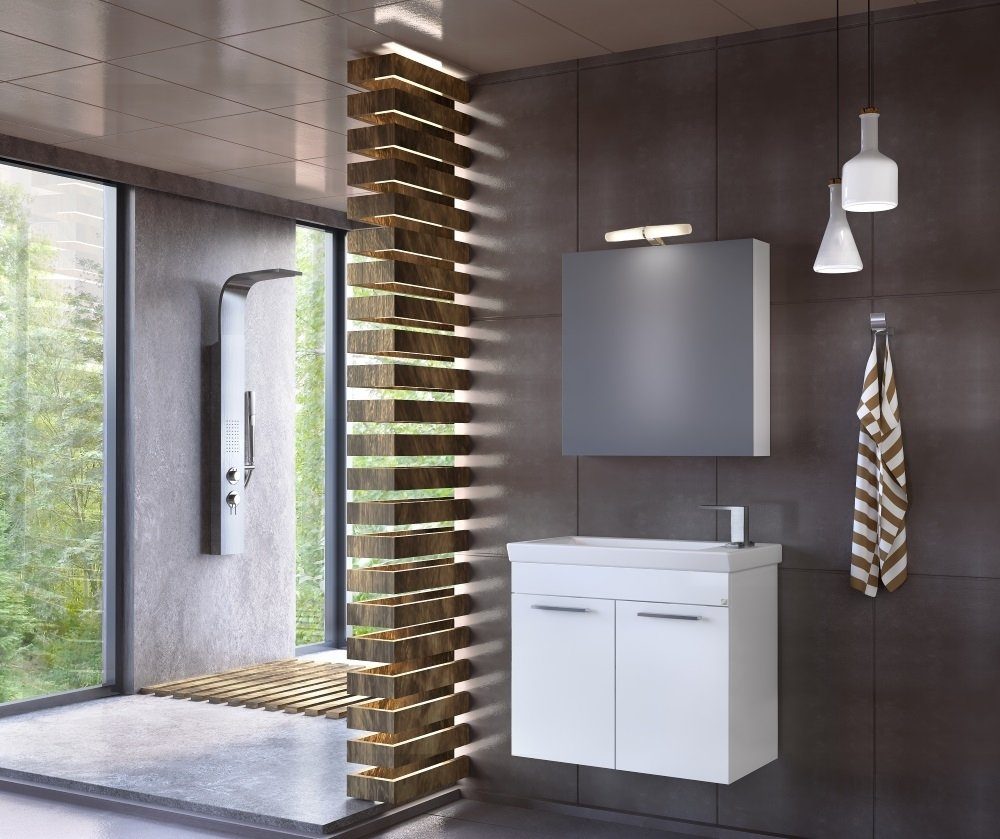 Status Møbelpakke från Nordamist med ett vitt vägghängt tvättställsskåp, porslinsskiva & integrerat porslinstvättställ, väggspegelenhet och belysningspaketet Fysi.