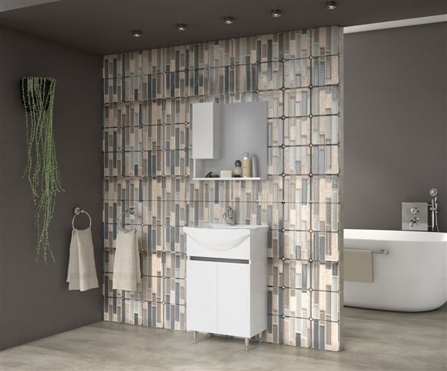 Mare møbelpakke fra Nordamist med et hvitt gulv stående servantskap, porselenservant og et speil med skap på venstre side.