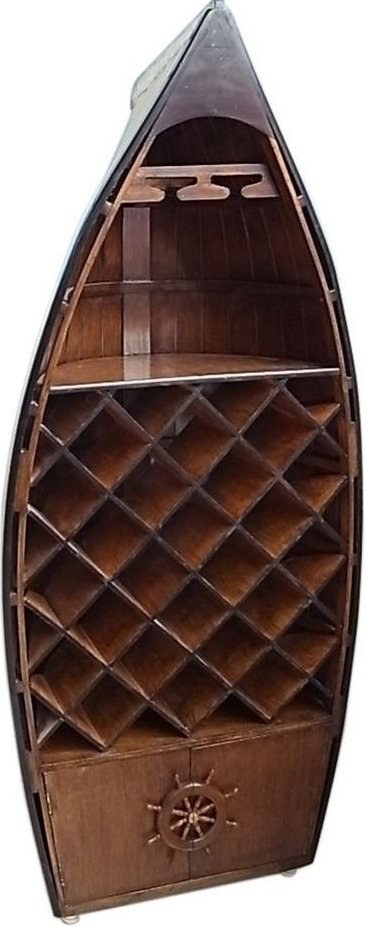 Vinstativ i form av en hvitmalt båt i massiv furu. Et vinstativ med en rustikk look. Det er plass til både vinflasker og hengere for vinglasss.