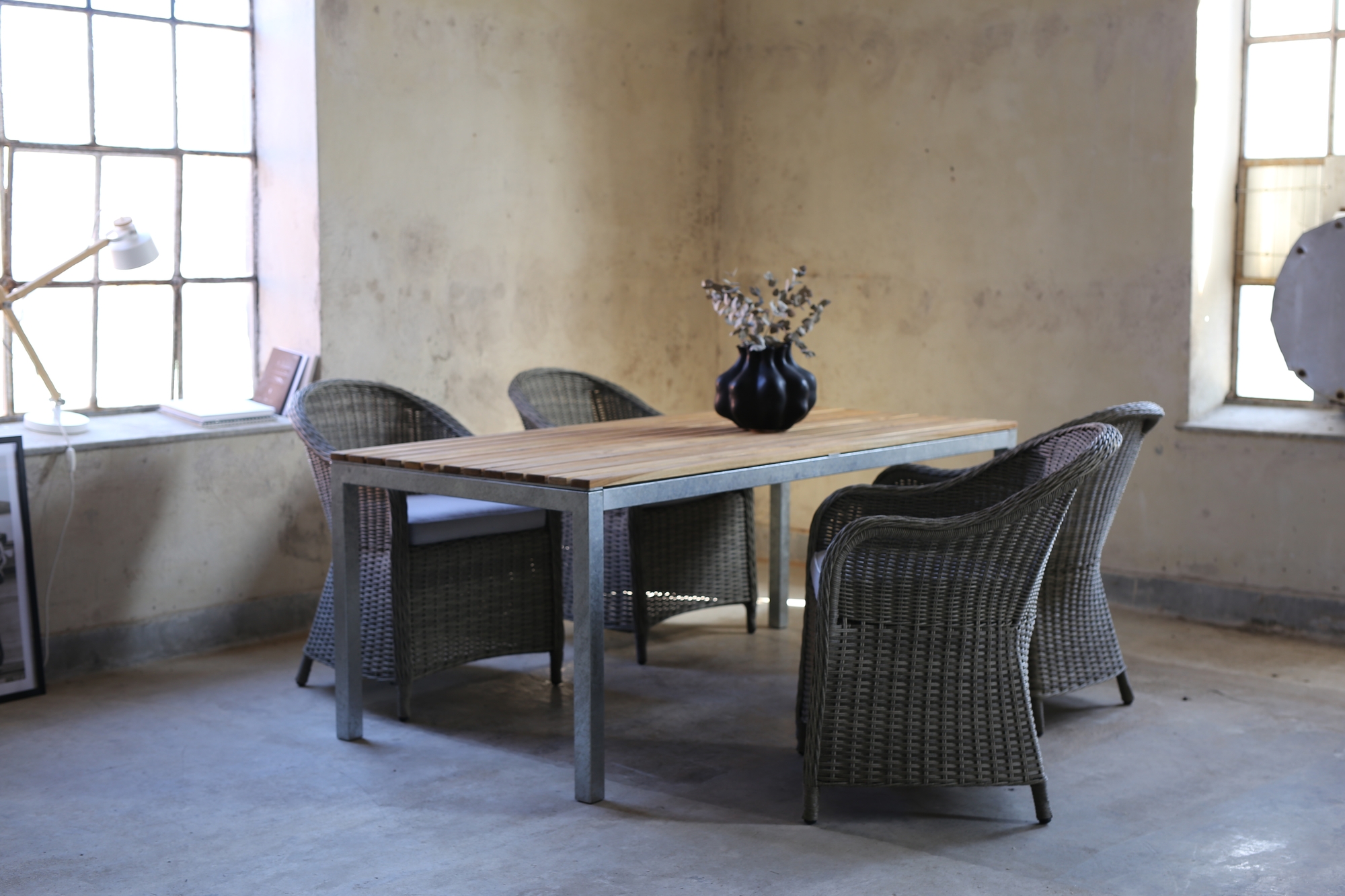Matgruppe til uteplass / vinterhage. Alva spisebord 190x90 cm med ramme i galvanisert stål med solide teakstenger for topplate. Fire matchende Mercury-lenestoler i brun kunstrotting gjør dette til en godmatgruppe for hele familien.