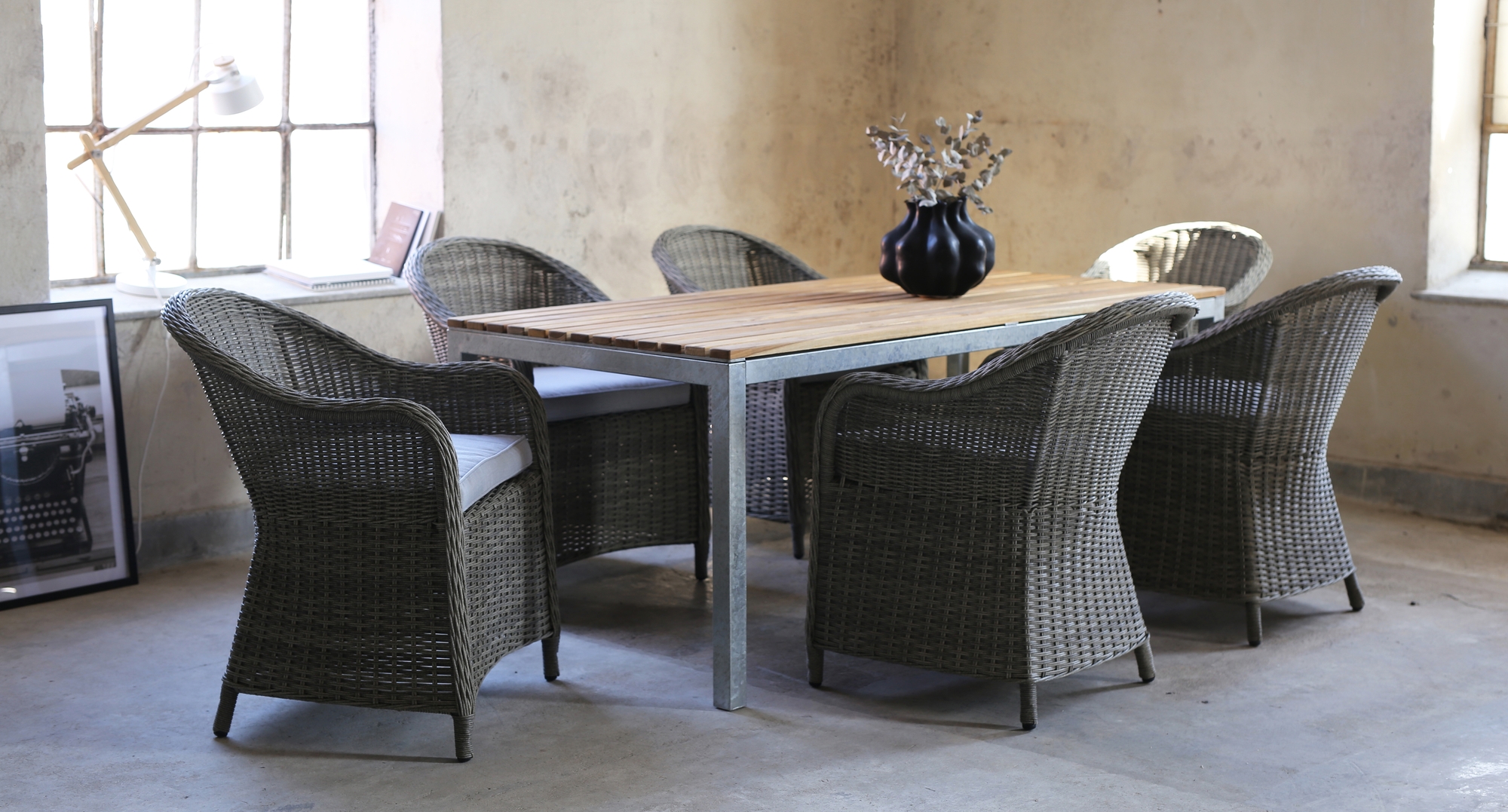 Matgruppe til uteplass / vinterhage. Alva spisebord 190x90 cm med ramme i galvanisert stål med solide teakstenger for topplate. Seks matchende mercury-lenestoler i grå kunstrotting gjør dette til en god matgruppe for hele familien.