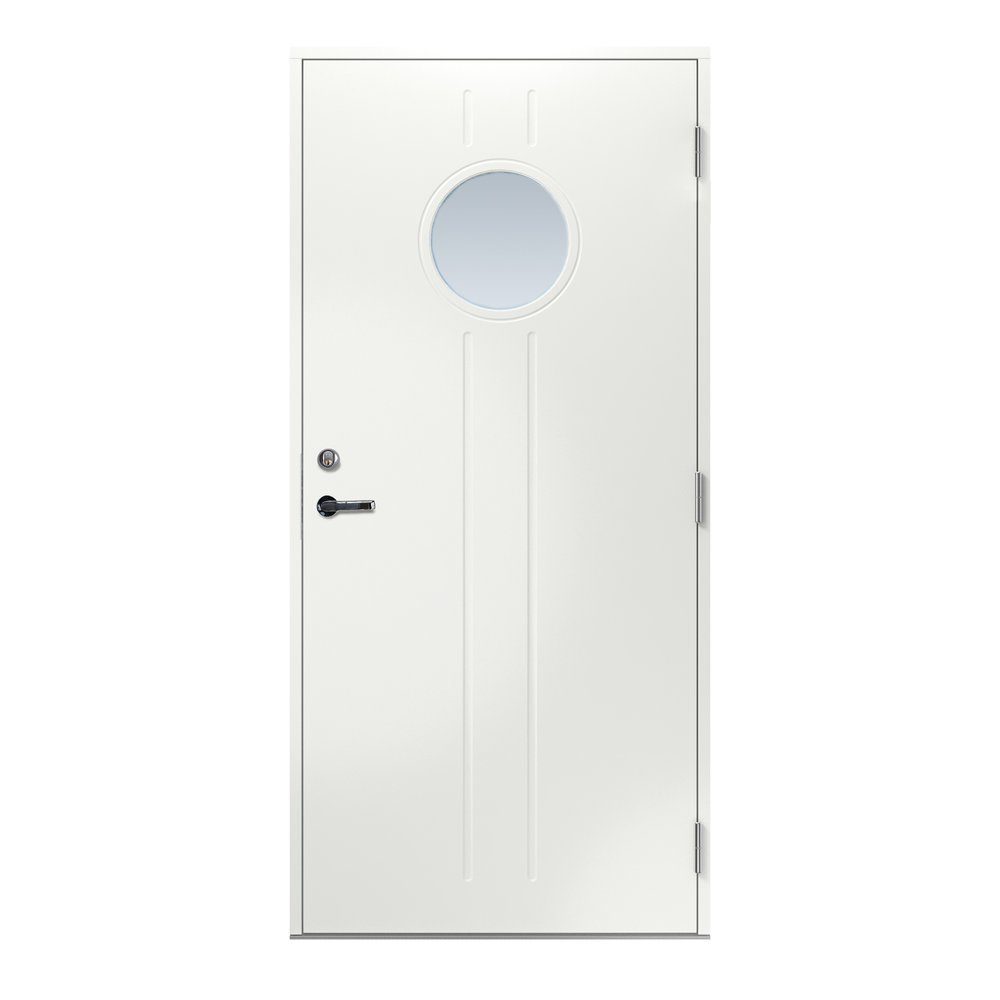 Ytterdør med rundt klarglass, sporfrest utside- og innside i Moa-serien. Alle dørene våre er solide og stilsikre. De leveres som standard tette, stillegående og energieffektive med fabrikkmontert tetning i åpning mellom dørpanel og karm. Når du bytter til en energieffektiv dør, har du gjort en innsats, både for miljøet og lommeboka.