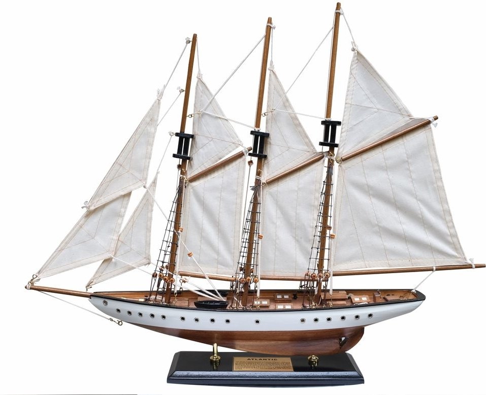 Modell av en flott seilbåt med store seil. Båten er av massiv brunmalt furu. Seil håndsydde av bomull.