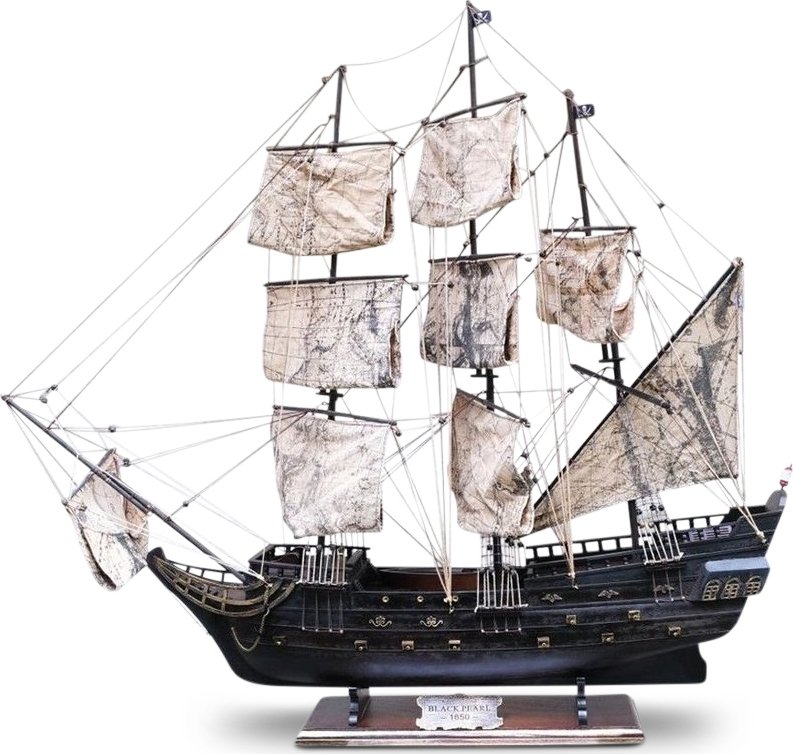 Stor modellbåt som forestiller Black Pearl fra Pirates of the Caribbean. Laget av furu, håndlagede seil av bomull. Finnes også i en mindre variant.