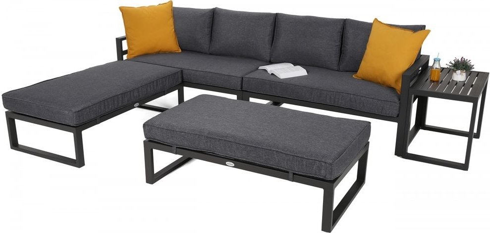 Fin modulsofa i 4 deler med et bord. Sofaen er oppdelt i to 2-seter deler med armlener og åpen ende, og to divan/fotskammel deler. Alt er laget av pulverlakkert aluminium. Sete- og ryggputer er inkludert.