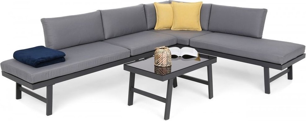 En fin modulær sofa som lett kan gjøres om fra hjørnesofa til to komfortable solstoler. Sofaen og bordet er laget av pulverlakkert aluminium. Bordplaten er laget av 5 mm herdet glass. Sete- og ryggputer er inkludert.