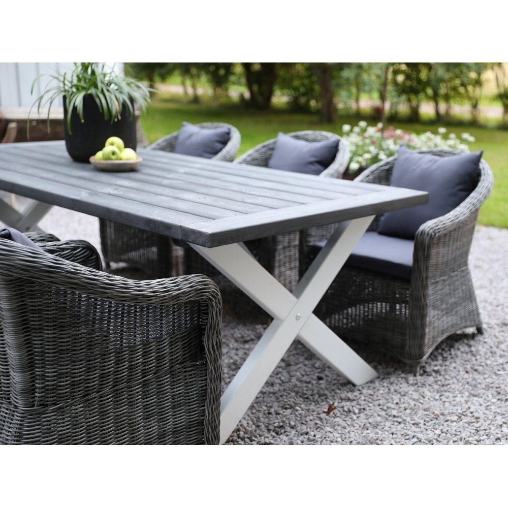 Spisebord i furu til utemøbler, med grå bordplate og hvit understell. Bordet har kryssben og en bordflate av tre som gir et robust og karakteristisk utseende. Hagebord som passer godt i hagestuen og uteplassen.