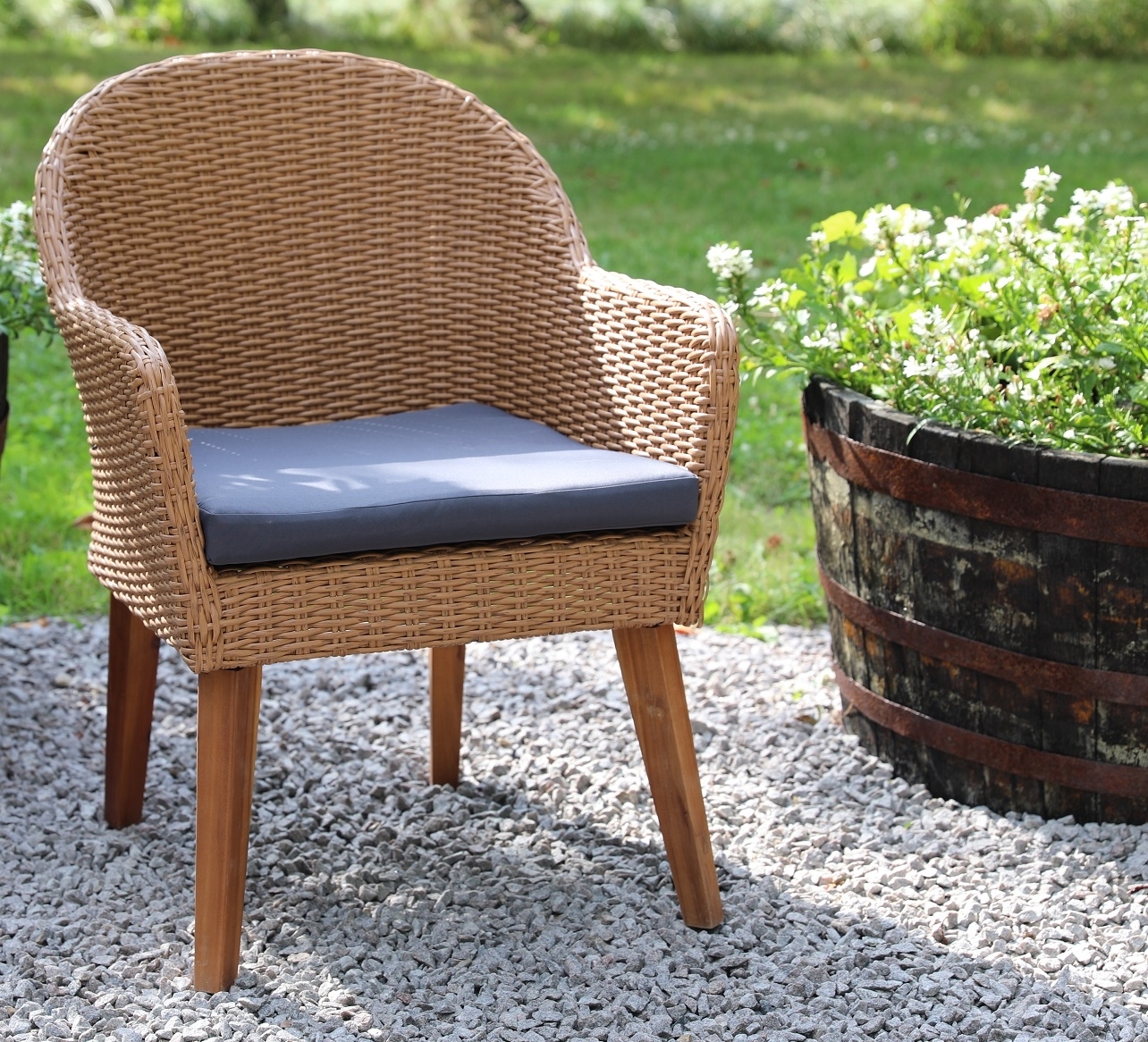 Inkludert 6 stk. Valetta-stoler i naturfarget rotting med brune ben. Lenestolen har en mørkegrå sittepute.
