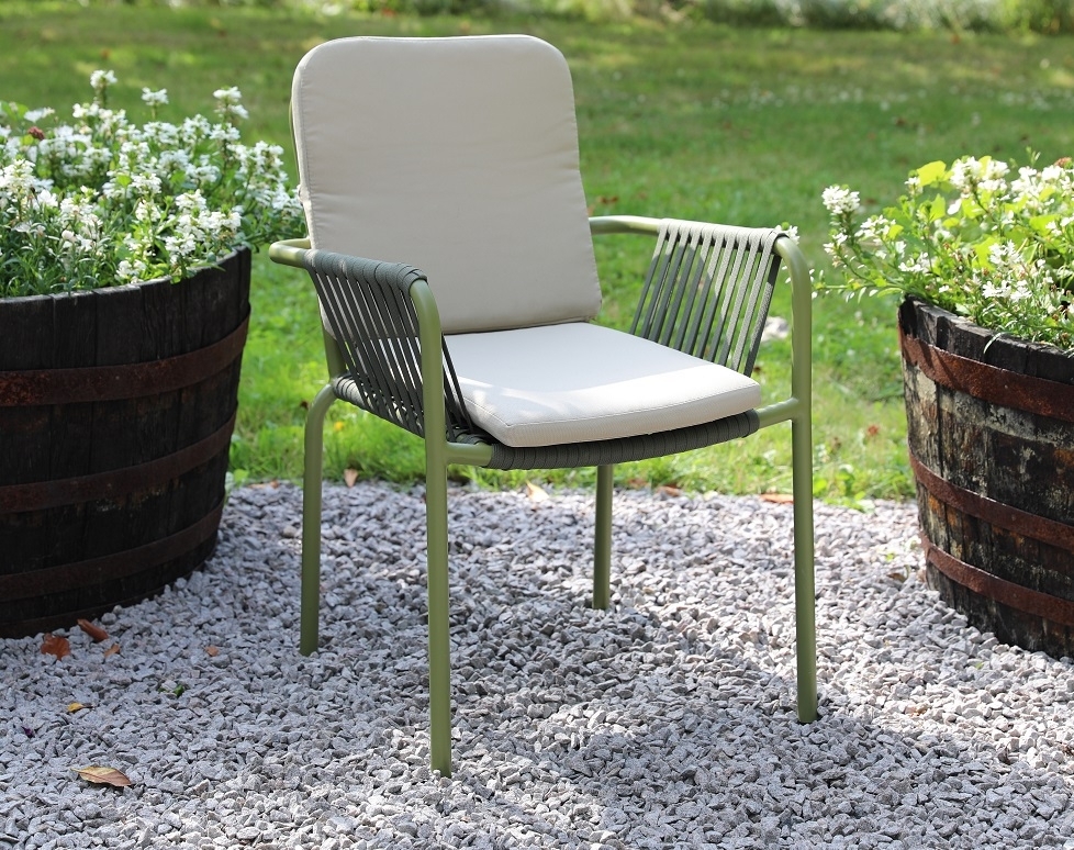 Inkludert 6 stk. flotte Lincoln stabelbare karmstoler i grønnlakkert aluminiumsramme med en beige pute for rygg og sete. Spisegruppen passer perfekt på balkong, uteplass og i vinterhagen.